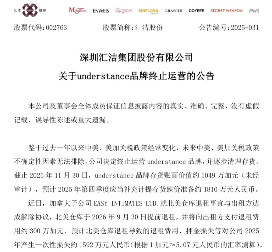 12月5日,汇洁股份(002763)发布公告,决定终止运营understance品牌,并逐步清理存货。此决定是由于过去一年中美、美加关税政策的频繁变化及未来不确定性因素的影响。