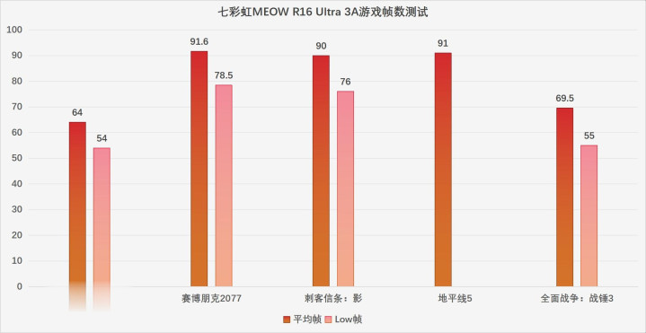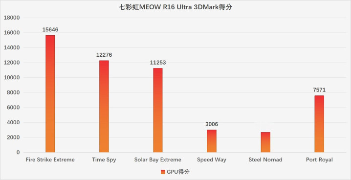 七彩虹MEOW R16 Ultra总体设计方向并非一款纯粹的性能怪兽,但CPU 55W+GPU 115W的释放能力也与当前主流游戏本持平,在优先让GPU发挥出满血性能的同时,双核心的温度也不算高,整体属于主流水准。