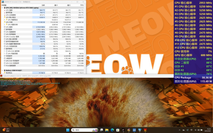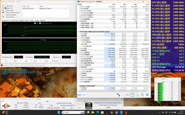 使用AIDA 64 Stress FPU+FurMark 3840*2160进行双烤测试,测试时间30分钟,CPU封装功耗55W左右、CCD1全核心2.55GHz,CCD2全核心2.47GHz,CCD1温度84度、CCD2温度80度;GPU频率2130MHz左右、功耗115W、温度84.4度左右。