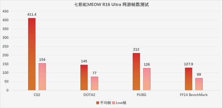将分辨率降低到1920*1200后,游戏帧数表现更多的依赖于CPU性能,七彩虹MEOW R16 Ultra R9 9850HX处理器凭借先进的Zen5架构、出色的高睿频能力,再加上HX处理器相比于纯移动端H后缀处理器更宽裕的缓存设计,让整机在网游的高帧表现也相当亮眼,满足电竞玩家对高帧率的需求。