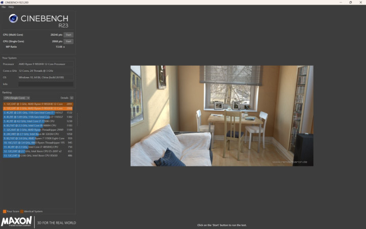 在CINEBENCH R23中单核性能2068pts,多核性能28246pts;