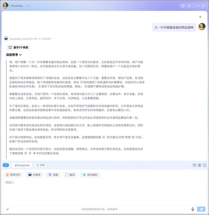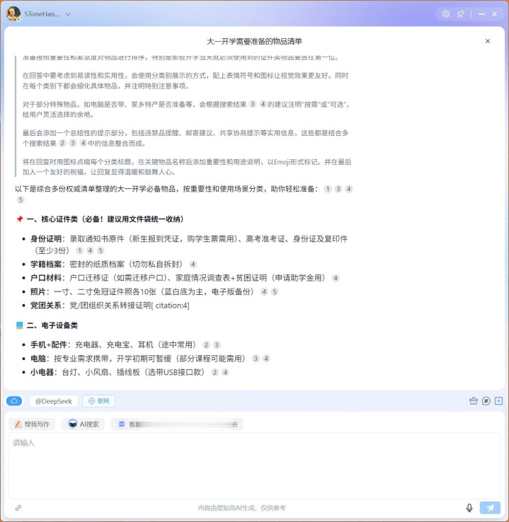 还有比如AI搜索功能,可以根据我们的要求进行网络信息搜索,这要比普通的Baidu、Bing之类的方便也好用多了。
