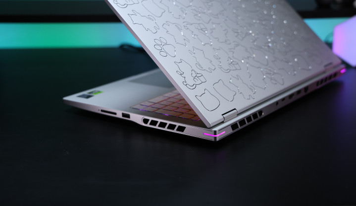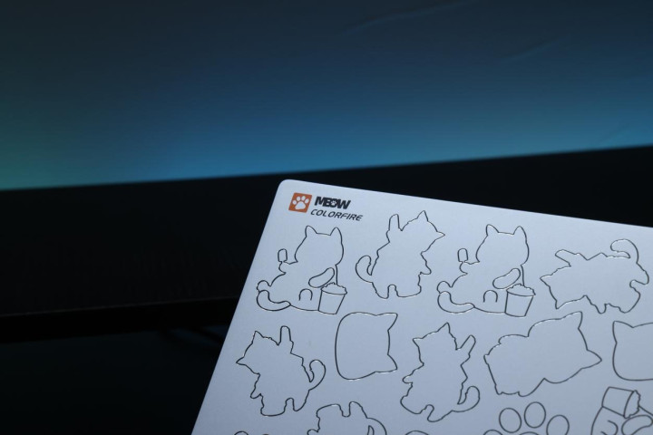七彩虹MEOW R16 Ultra的A/C/D三个面全部采用航空铝合金材质打造,表面为阳极喷砂工艺,赋予了外壳更加温润的手感,也保证长时间高负荷使用时表面相对保持更加干爽的触感。而表面这样的工艺与材质也为A面”刻上“的小猫图案提出了更高的工艺需求。