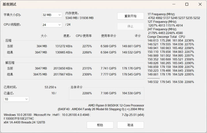 在看重CPU多核性能、缓存大小及内存性能的压缩/解压缩场景中,7-Zip BenchMark的压缩评分为149.532GIPS、解压缩评分179.545GIPS,总评分164.538GIPS.