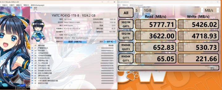 在CrystalDiskMark中,YMTC PC41Q 1TB的最大读取速度5777MB/S、最大写入速度5426MB/S。YMTC PC41Q是基于晶栈Xtacking 3.0架构的四通道主控PCIe 4.0*4通道固态硬盘,采用的是Dram-Less设计,满载下温度较低,非常适合放到笔记本电脑这种设备中使用。机身中还提供了一条PCIe 5.0的M.2插槽可供后续扩展使用。