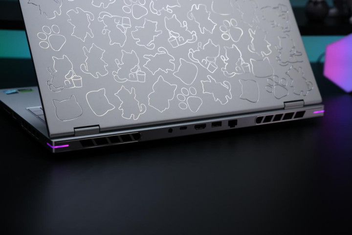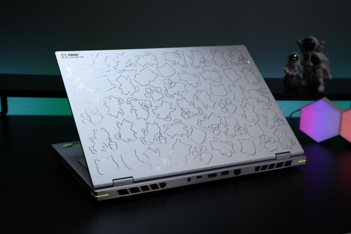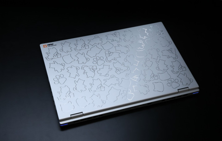 金属材质下,如果简单的平面蚀刻难免会出现毛刺、精度残次不齐等现象,对于笔记本这种需要长期接触的产品来讲会非常影响用户的观感和使用体验,而七彩虹MEOW R16 Ultra则采用了CNC精雕工艺,并进行了打磨、喷砂、3次高光精雕、二次氧化等10道主工序才打造完成壳体,从而呈现出了如今这副精细且统一的观感和触感,A面高达48个不规则小猫图案,可见至少七彩虹MEOW R16 Ultra的整个壳体成本就很“Ultra”了,同时也再次与市面上的其他机型设计打出了差异化。