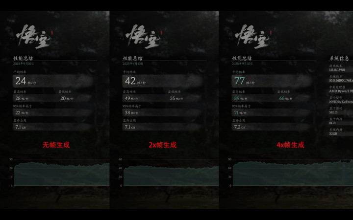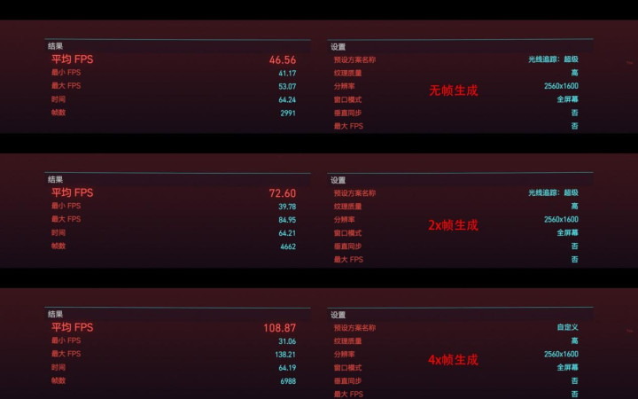 而针对于DLSS 4的专项测试,我们继续进一步提升画质,在《黑神话:悟空》中将画质调整为“100%渲染+影视级”,在《赛博朋克2077》中将画质调整为“光线追踪:超级”,分别测试两款游戏在这种画质下不开启帧生成、开启2倍帧生成、开启4倍帧生成的帧数情况: