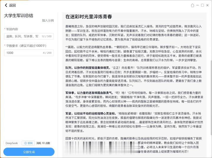 精细化、场景化的功能越来越多了,比如最近大学新生朋友们肯定大部分都在参与军训,难免有些感想之类的作业,星知岛就适时的推出了“大学生军训总结”这一功能,我们输入训练相关项目与要求字数便可以在半分钟内直接生成出这篇文章。