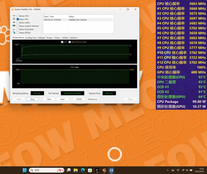 使用AIDA 64 Stress FPU进行CPU的单烤测试,测试时间30分钟,CPU封装功耗100W、CCD1和CCD2全核心都在3.7GHz左右,CCD1温度93度、CCD2温度91度。