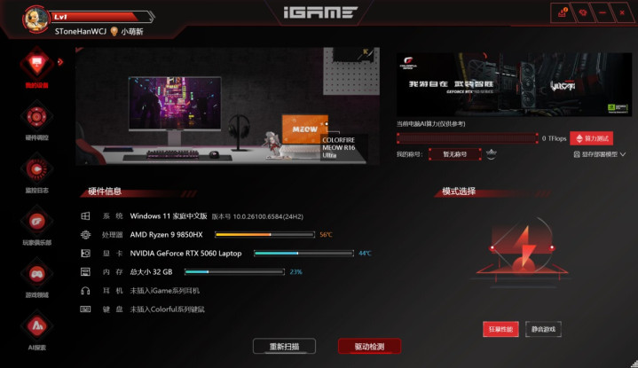 整机控制中心由Control Center升级至了七彩虹游戏本中更高级的iGame自在星球,性能模式提供了满载和静音两个选项,虽然看上去没有其它游戏本那么多,但是实际使用起来逻辑更清晰——高负载时就选满载,其余时间选静音模式就OK了。